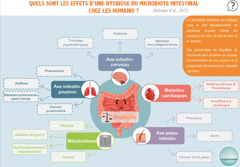 L’étude du microbiote intestinal est récemment devenue centrale pour la recherche médicale. S’il est probable qu’il constitue un biomarqueur qui reflète différents états de santé, il est également important d’appréhender l’aspect symbiotique qui existe entre ce microbiote et l’organisme. Ainsi, si certaines maladies sont secondaires à une dysbiose, il semble évident que cette dernière peut être causée par certains évènements de santé. Ces relations bidirectionnelles, pour l’heure à peine décrites, doivent continuer à être explorées afin de pouvoir mieux établir le sens des liens qui existent entre dysbiose et maladies.