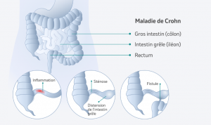 Les maladies inflammatoires chroniques de l’intestin (MICI), comme la maladie de Crohn et la rectocolite hémorragique, sont liées à une activation inappropriée du système immunitaire dans l’intestin. Derrière leur survenue se cachent des facteurs génétiques et environnementaux (alimentation, âge…). Le rôle du microbiote a été suspecté devant l’amélioration des symptômes de patients sous traitement antibiotique, ou encore en raison de la disparition de lésions inflammatoires intestinales chez des personnes dont la paroi intestinale n’est plus au contact des fèces (suite à la mise en place d’une dérivation fécale). Ceci s’explique probablement par le rôle des bactéries intestinales et leurs métabolites dans l’équilibre de la réponse immunitaire locale.